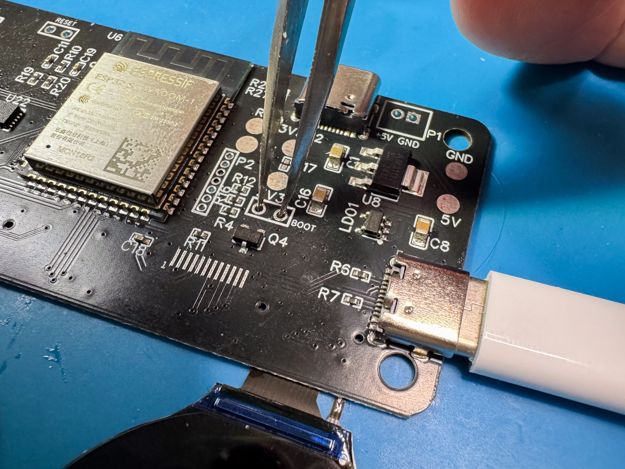 QuadClock PCB: Use tweezers or a wire to short the two pins marked 'BOOT' on the PCB (or press the button SW4) while inserting the cable.